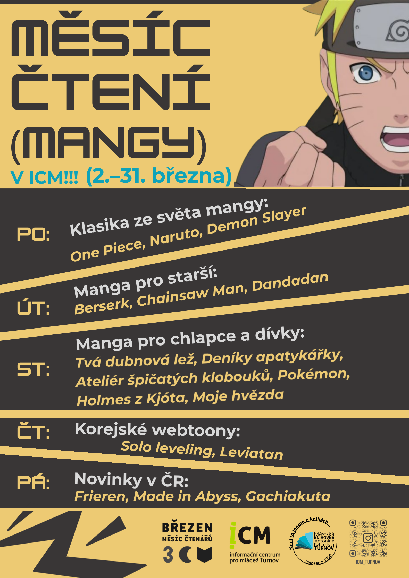 « Všechny Akce Měsíc čtení mangy 2. 3. | 12:00 – 31. 3. | 17:00 « Magicový klub Lorcana » + Kalendář Google+ Přidat do iCalendar Podrobnosti Zahájení: 2. 3. | 12:00 Ukončení: 31. 3. | 17:00 Rubrika Akce: Ostatní Pořadatelé Pavel Cidlinský Lucie Zoulová Místo konání Informační centrum pro mládež Jeronýmova 517 Turnov, 51101 Česká republika + Google Mapa Telefon: 481 313 177 Webová stránka: www.icm.turnov.cz